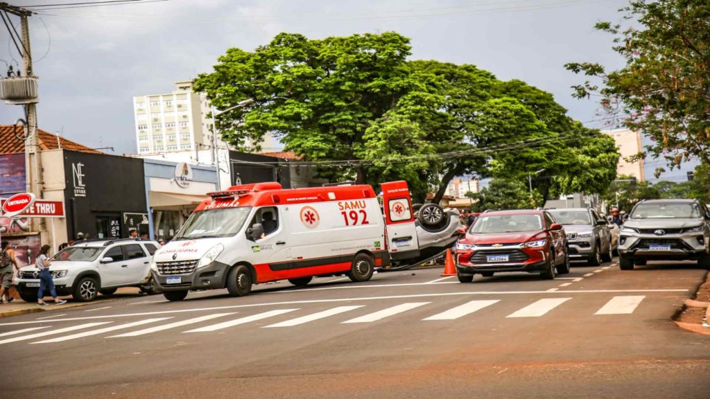 Na tarde desta sexta-feira (16), motorista de um Nissan Kicks sofreu acidente com capotamento na Rua Pedro Celestino, na região central de Campo Grande. Ela atingiu dois carros estacionados antes do veículo capotar.