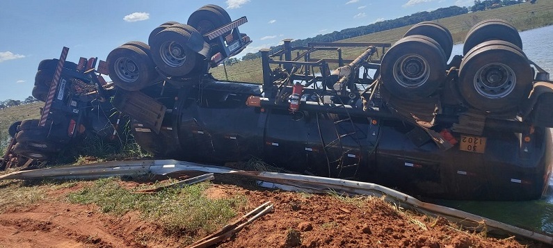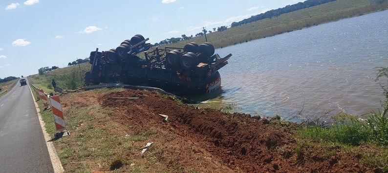 O bitrem colidiu, destruiu o guard-rail e caiu sobre uma lagoa na margem da rodovia. O motorista, que estava sozinho no veículo, não se feriu.