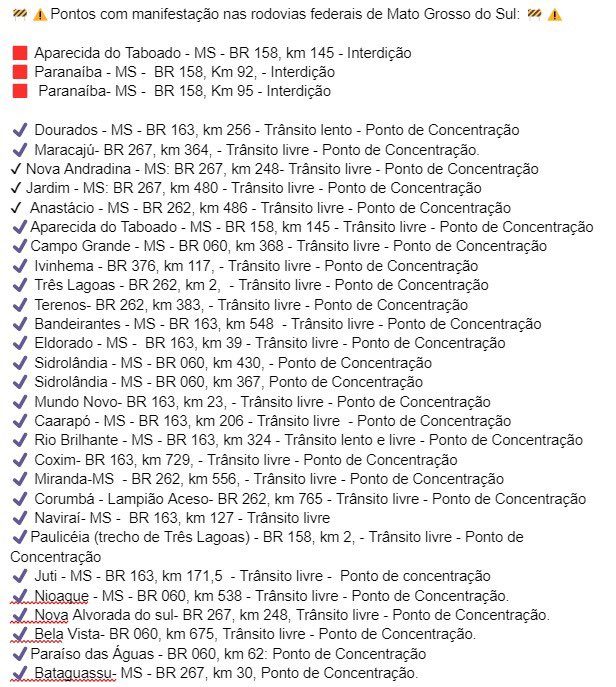 Balanço atualizado da PRF (Polícia Rodoviária Federal) aponta que Mato Grosso do Sul tem três pontos de interdição em rodovias federais. Na tarde desta quarta-feira (2), dois dias após o início dos protestos, permanecem com trânsito impedido o quilômetro 145 da BR-158, em Aparecida do Taboado, e dois trechos da BR-158, em Paranaíba, nos quilômetros 92 e 95.