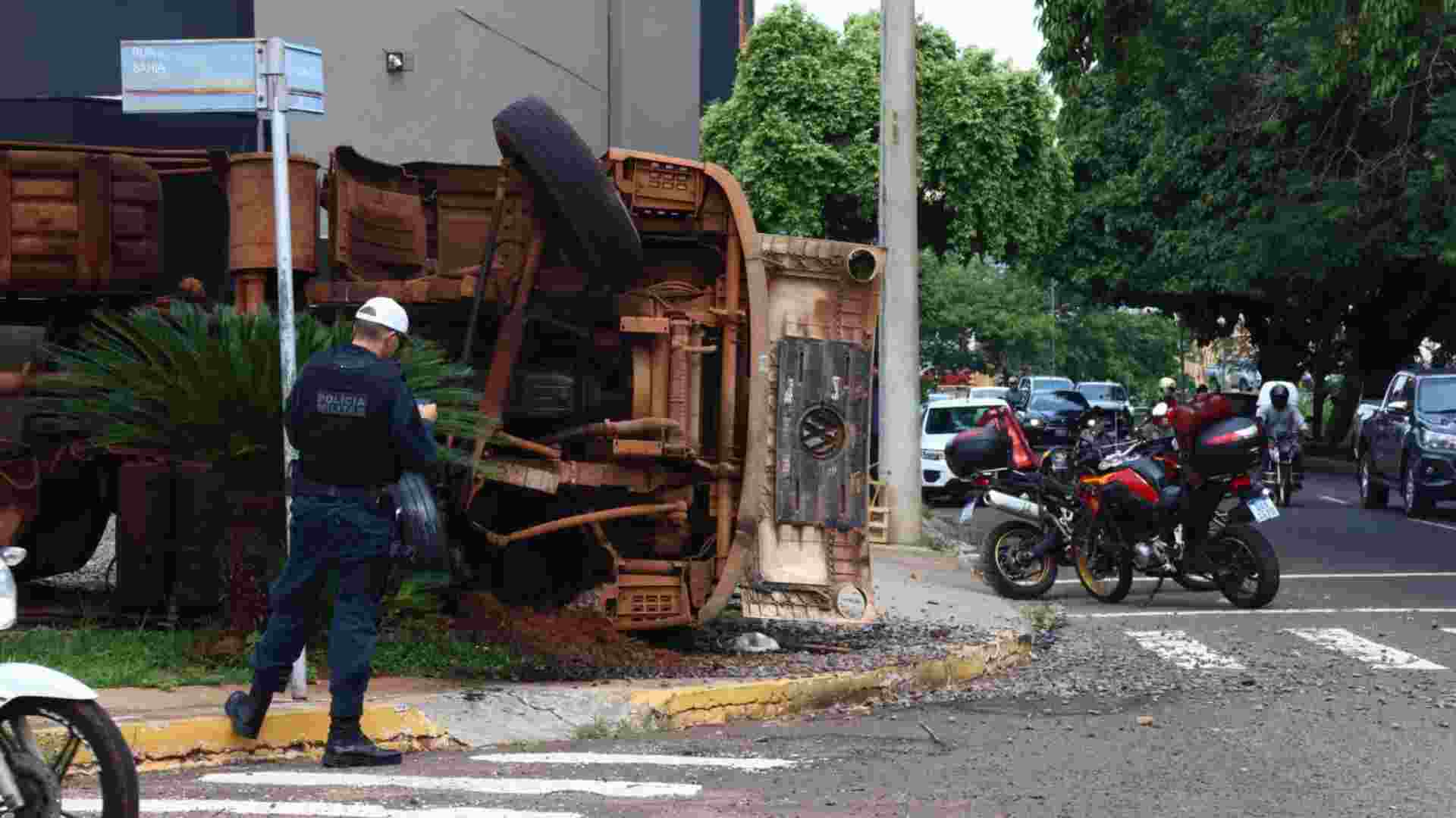 Um motorista de 36 anos sofreu ferimentos após tombar um caminhão betoneira carregado com concreto, no cruzamento da Rua Chaadi Scaff com a Joaquim Murtinho, próximo ao acesso para Rua Bahia, no bairro Itanhangá Park, em Campo Grande, na manhã desta sexta-feira (3). O veículo perdeu o freio durante a descida, mas não atingiu nenhum veículo.