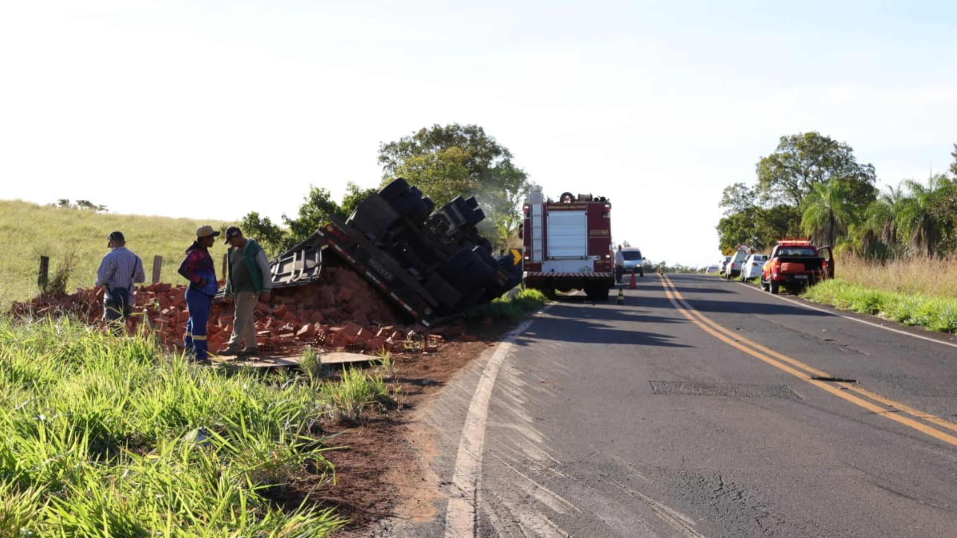 O veículo com placas de Campo Grande seguia para Rochedo carregado de tijolos e acabou tombando às margens da rodovia.