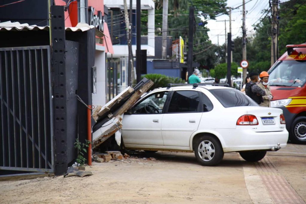 O carro só parou ao atingir um muro, que foi derrubado. Então, o motorista ficou retido no carro e foi socorrido pelo Corpo de Bombeiros. Ele relatou que teria passado mal e com isso atravessou a avenida.