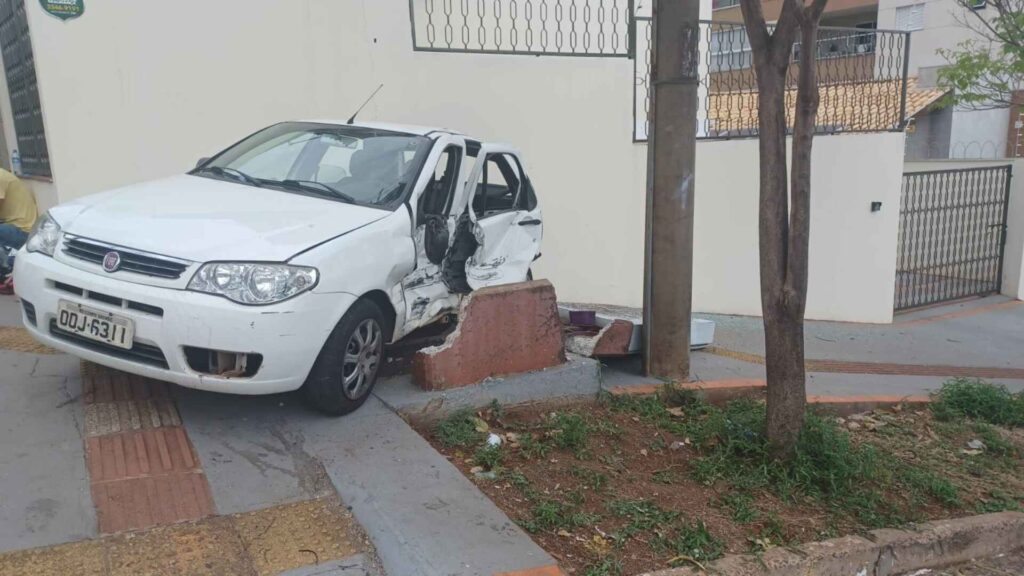 Após a colisão com a caminhonete, a condutora bateu no muro de uma casa e atingiu o quadro de energia do imóvel. O carro ficou bastante danificado devido à batida