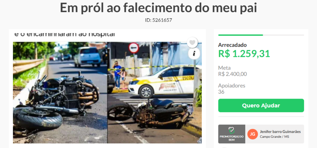 A ‘Vakinha’ online foi criada pela filha do motociclista. “Em prol do falecimento do meu pai”, diz o título.