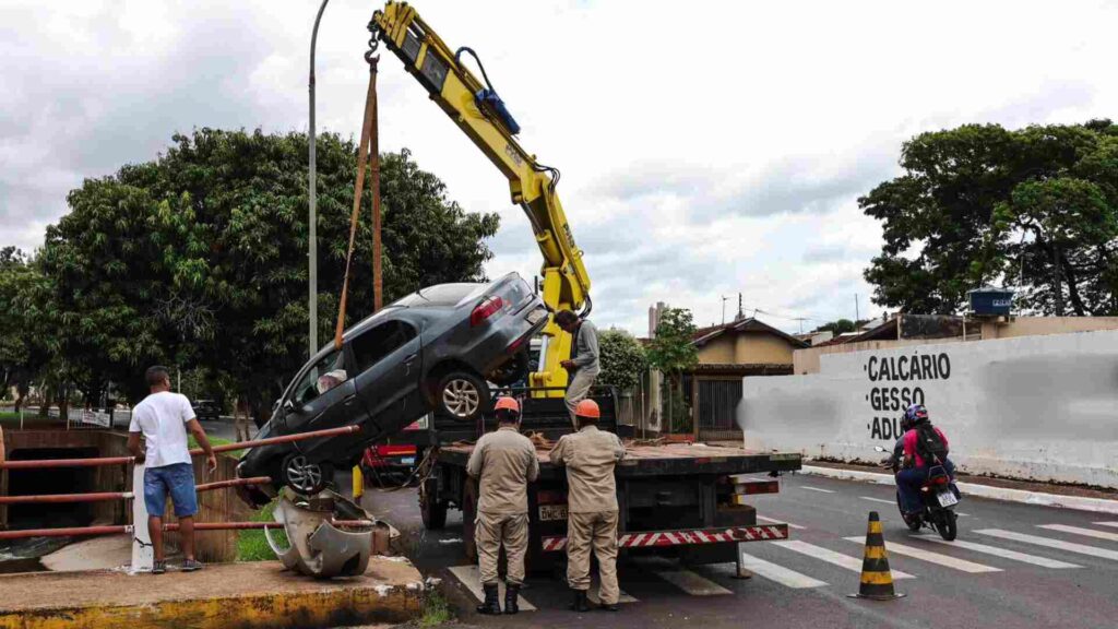 Com o acidente, o Voyage foi arremessado e bateu contra o guard rail. O veículo ficou pendurado em direção ao córrego. Já o Versa teve o parachoque da frente arrancado com a colisão.