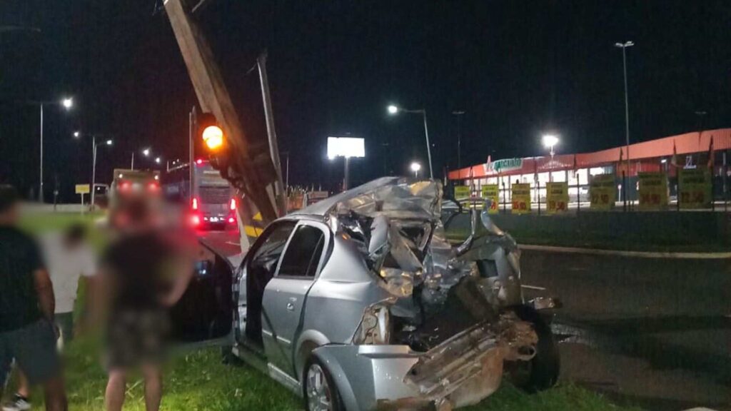 Um carro ficou destruído após uma batida com um caminhão da Solurb, concessionária responsável pelo manejo de resíduos sólidos de Campo Grande, na Avenida Duque de Caxias, região do bairro Santo Antônio, na madrugada desta sexta-feira (3). Um poste do semáforo do cruzamento caiu e um hotel da região ficou sem energia elétrica.