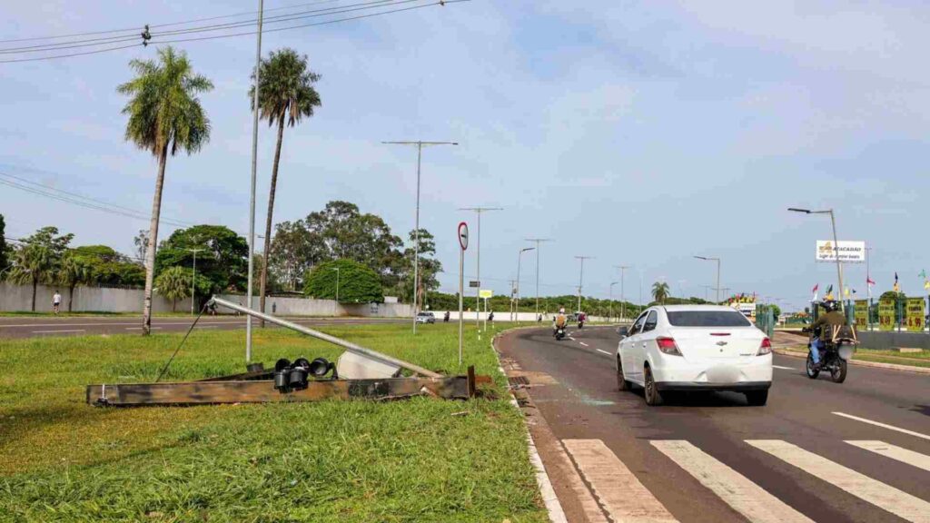 Devido ao acidente, o poste do semáforo do cruzamento ficou pendurado pela fiação elétrica. Porém, no início da manhã desta sexta (3), a estrutura já havia caído.