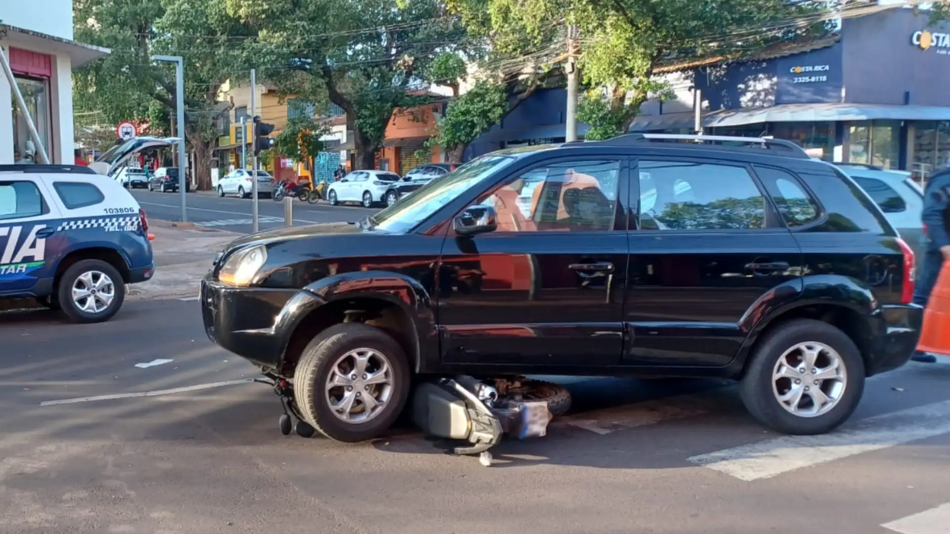 Momentos depois, uma terceira colisão aconteceu. A condutora de um Hyundai Tucson, de cerca de 60 anos, também tentava converter na mesma direção, mas não viu a moto caída no chão e acabou passando por cima dela. A motorista do Tucson afirmou que a via não estava sinalizada para alertar sobre o acidente.