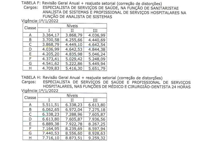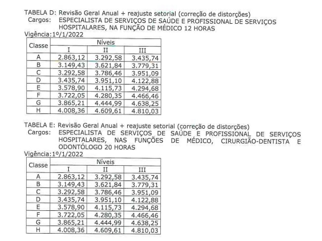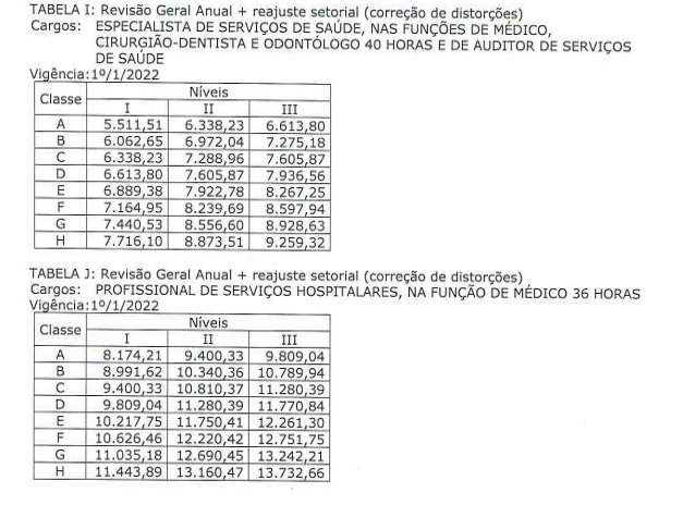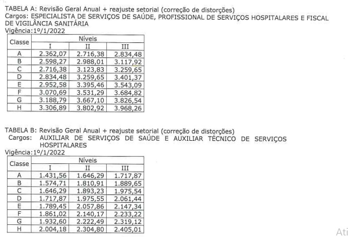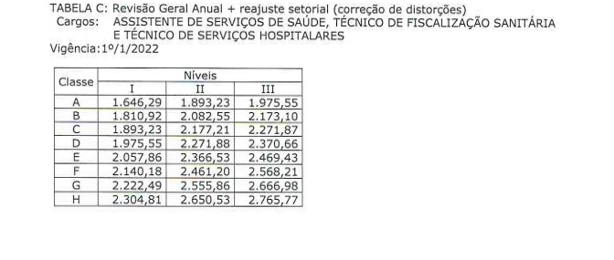 A proposta é de reajuste de revisão geral anual mais reajuste setorial (correção de distorções). O salário mais baixo, de R$ 1,4 mil, é de auxiliar de serviços de saúde no início de carreira, nível I.