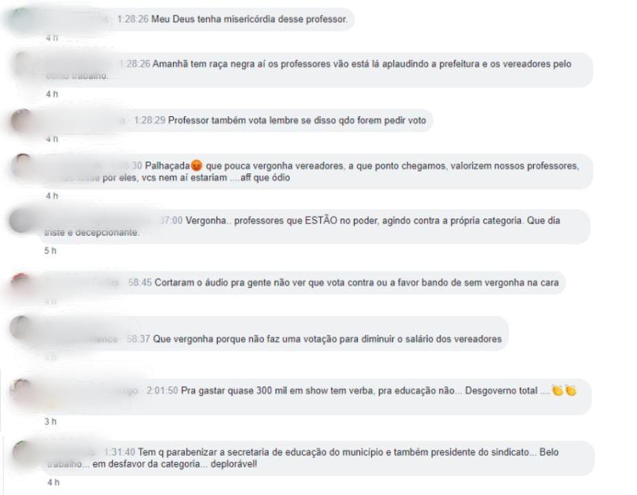 Alguns professores que estavam assistindo a transmissão da votação se manifestaram em comentários na live, “palhaçada, que pouca vergonha vereadores”. Outro comentário dizia, “professor também vota, se lembre quando for pedir voto”.