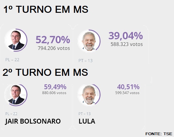 Já o petista obteve 39,04% do total de MS no 1º turno, referentes a 588.323 votos. Lula também melhorou o resultado neste domingo com 11.224 votos a mais que no início do mês.