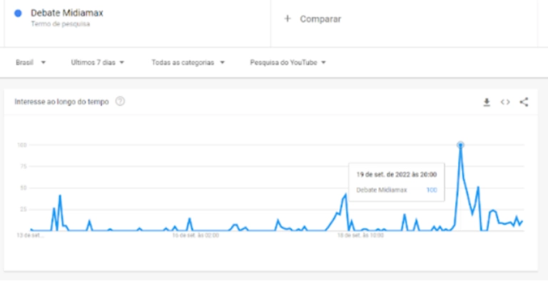 O número de pesquisas pelo termo “Debate Midiamax” no Google atingiu a pontuação máxima de 100, às 20h da segunda-feira, horário de início do debate, confirmando o interesse do público em acompanhar o tradicional embate promovido pelo Midiamax.