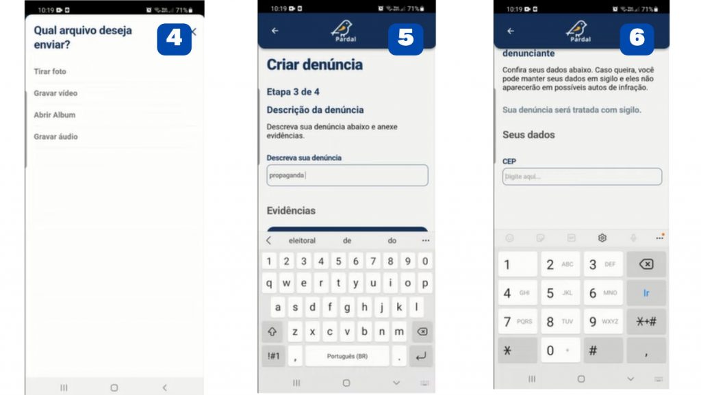 - O último passo é informar seu CEP e posteriormente seus dados. O aplicativo não recebe denúncias anônimas, porém o eleitor pode selecionar a opção de anonimato.