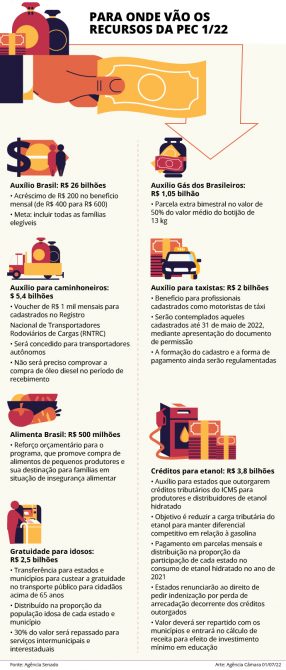 Na prática, a medida permite ao governo ampliar benefícios sociais que não seriam autorizados em ano eleitoral, como o Auxílio Brasil de R$ 600 e auxílio de R$ 1 mil para caminhoneiros. A proposta também prevê recursos extras para o vale-gás de cozinha, o programa Alimenta Brasil, taxistas, o financiamento da gratuidade no transporte coletivo de idosos e para compensar estados que reduzirem a carga tributária dos biocombustíveis. O impacto total dessas medidas é de R$ 41,2 bilhões.