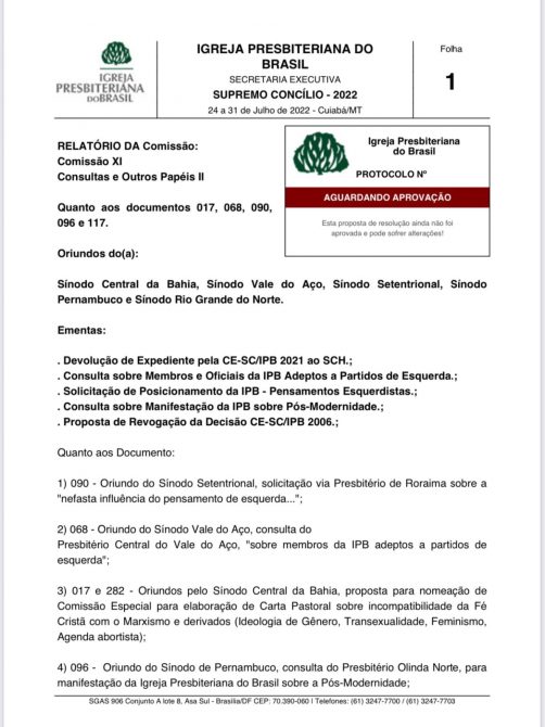 De acordo com o documento, o Presbitério de Roraima cita ‘nefasta influência do pensamento de esquerda’. O Presbitério Central do Vale do Aço pede consulta sobre ‘membros da IPB adeptos a pensamentos de esquerda’ e Pernambuco pediria posicionamento do Concílio sobre a pós-modernidade.