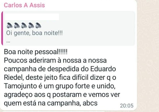 “Boa noite pessoal!!!! Poucos aderiram à nossa campanha de despedida do Eduardo Riedel, deste jeito fica difícil dizer q o Tamojunto é um grupo forte e unido, agradeço aos que postaram e vamos ver quem está na campanha, abcs (sic)”, disse Assis.