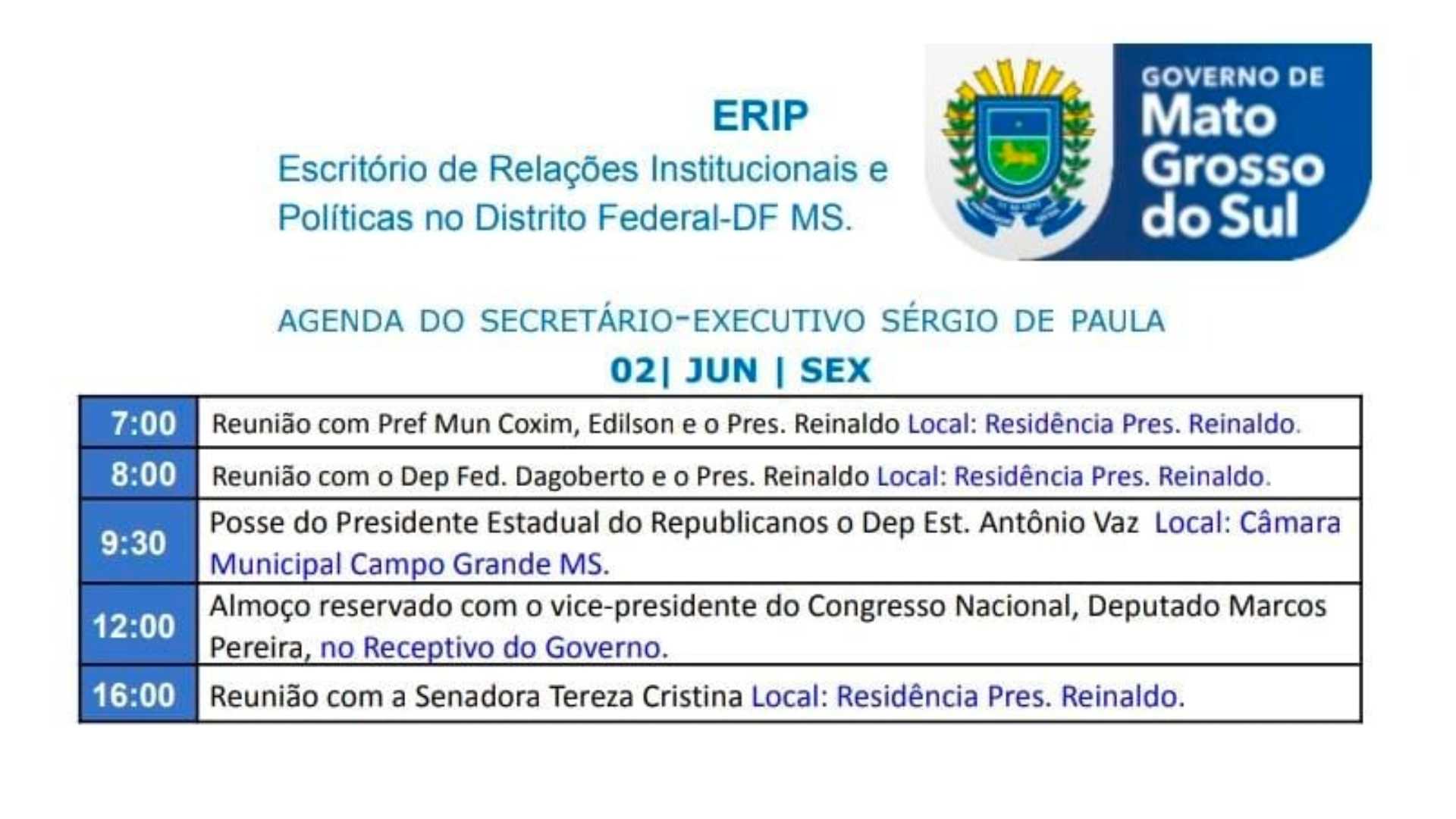 Conforme o Jornal Midiamax confirmou, a reunião estava em pauta oficial do secretário-executivo, Sérgio de Paula. O ex-chefe do MPMS (Ministério Público de Mato Grosso do Sul) Paulo Cezar dos Passos também foi até a casa do ex-governador.