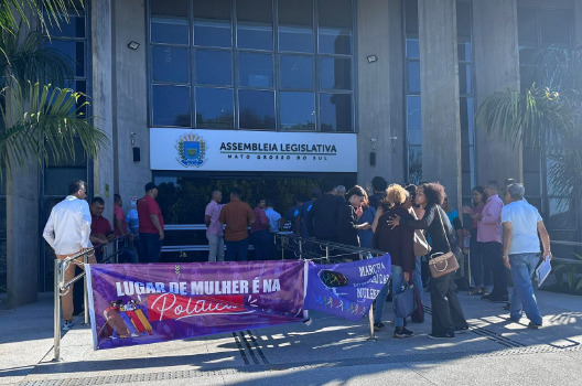 Com o cartaz ‘lugar de mulher é na política’, militantes receberam os convidados para a posse na Alems (Assembleia Legislativa de Mato Grosso do Sul).