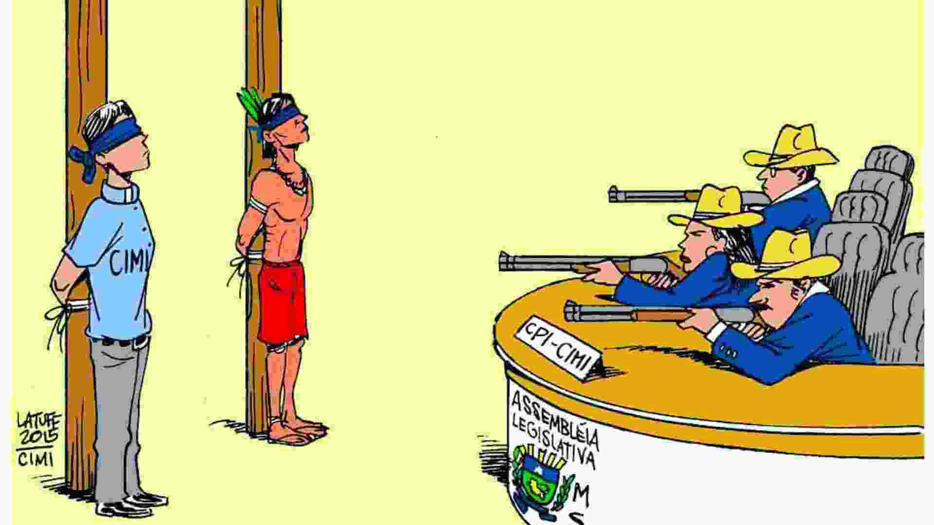 Em seguida, uma charge assinada por Carlos Latuff, em que um indígena e um integrante do CIMI estão amarrados sob alvo de três armas, seguradas por três pessoas com chapéu sentadas atrás de uma mesa. No desenho, a mesa tem o brasão da Alems (Assembleia Legislativa de Mato Grosso do Sul).