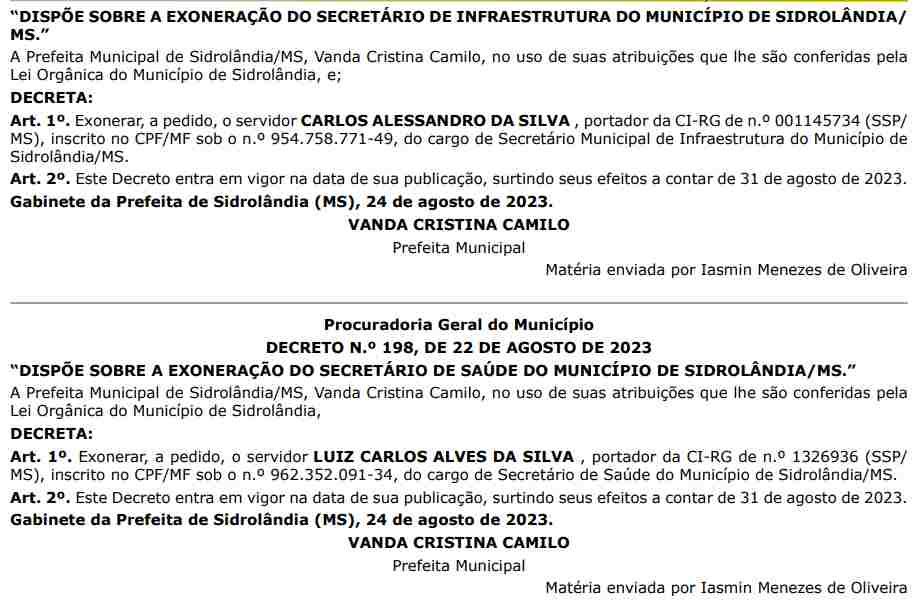 Conforme as publicações assinadas pela prefeita Vanda Cristina Camilo (PP), os servidores foram exonerados a pedido. Carlos ocupava cargo de secretário de Infraestrutura do Município de Sidrolândia.