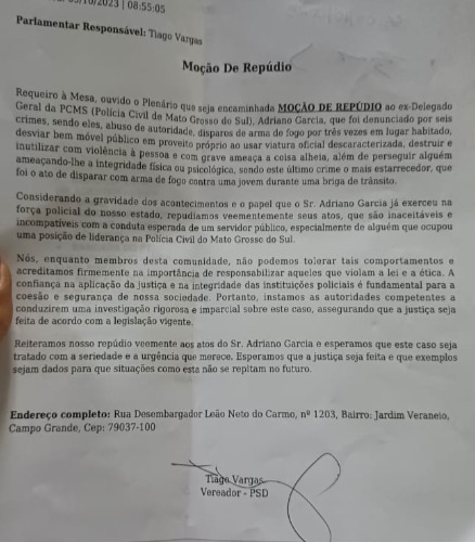 O vereador Tiago Vargas (PSD) apresentou nesta terça-feira (3) moção de repúdio contra o ex-DGPC (Delegado-Geral da Polícia Civil) Adriano Garcia. Na justificativa, Tiago afirma que Adriano cometeu seis crimes ao disparar contra uma garota em Campo Grande.