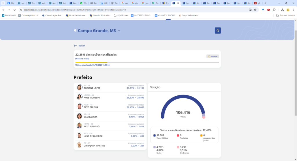Com 22,28% das urnas apuradas, parcial mostra Adriane Lopes (PP), com 31,71% e Rose Modesto (União), com 29,37%.