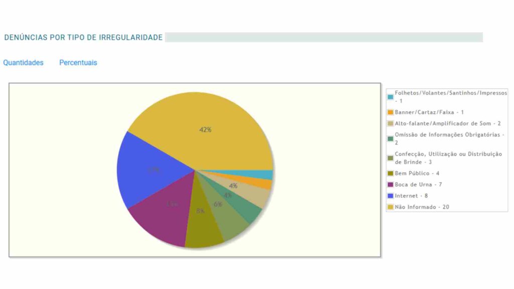 Então, das 48 denúncias recebidas pela Justiça Eleitoral, 20 não tiveram tipificação informada e cabe ao TSE caracterizar o tipo de crime que se trata ou não. As demais denúncias tratam sobre: internet (8), boca de urna (7), bem público (4), confecção, Utilização ou Distribuição de Brinde (3), Omissão de Informações Obrigatórias (2), Alto-falante/Amplificador de Som (2), Banner/Cartaz/Faixa (1) e Folhetos/Volantes/Santinhos/Impressos (1).