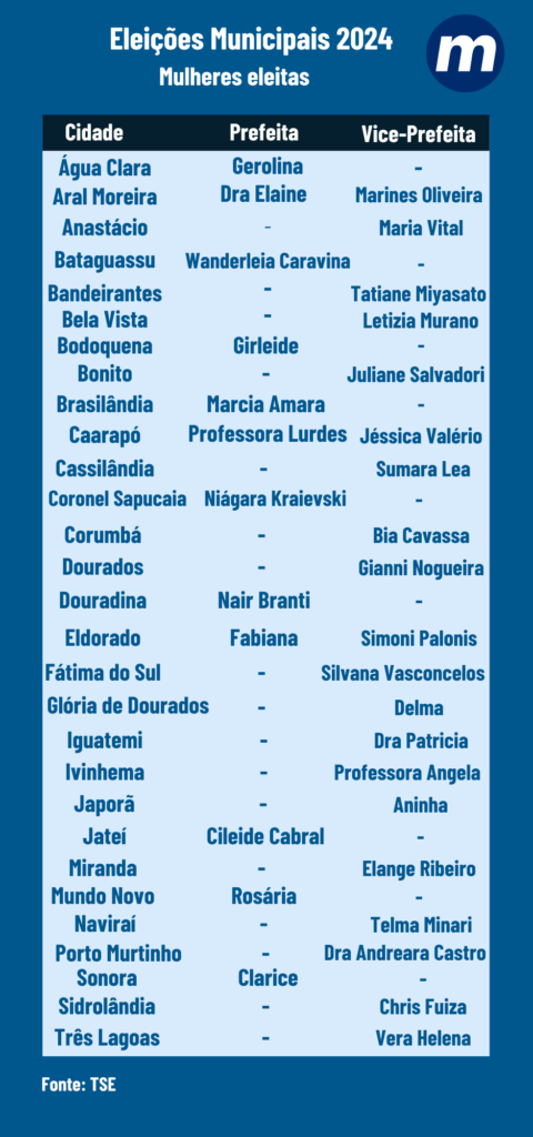 Já entre as vice-prefeitas, são seis eleitas do Progressistas, quatro do PSDB, duas do Republicanos, duas do MDB, duas do PL, duas do Podemos e uma do União. Das cidades com mulheres na liderança, três têm presença feminina como prefeita e vice, sendo Aral Moreira, Caarapó e Eldorado.