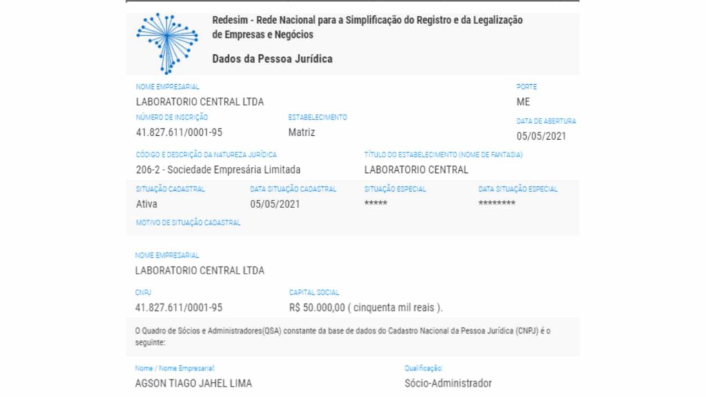 Consulta oficial e documentada ao CNPJ no site da Receita Federal mostra que a empresa foi aberta em maio de 2021, com capital social de R$ 50 mil.