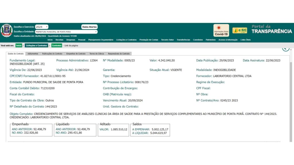 De acordo com informações oficiais extraídas do Portal da Transparência do município de Ponta Porã, desde o início do contrato, foram liquidados, ou seja, efetivamente pagos ao Laboratório, a quantia de R$ 382.930,65. Mesmo assim, o termo aditivo foi feito com acréscimo de valores.