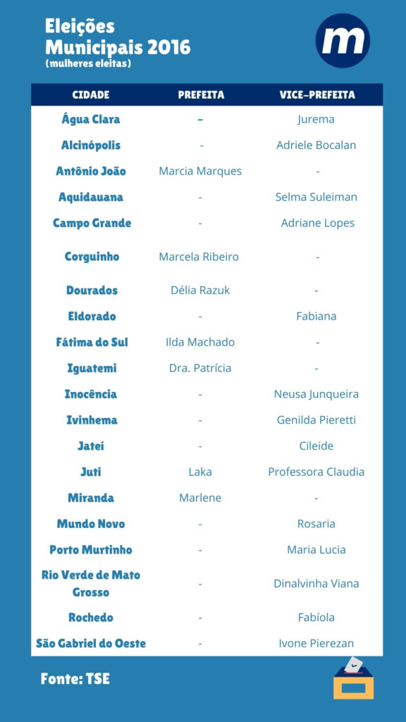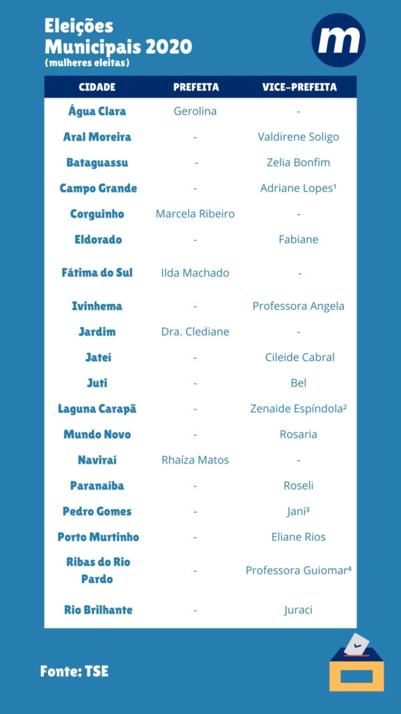 Conforme o levantamento, o número de eleitas para o posto também aumentou no país. A quantidade de mulheres que se tornaram vice-prefeitas chegou a 834 em 2016. Em 2020, saltou para 927, um aumento de 11%. Mato Grosso do Sul, no entanto, foi na contramão das estatísticas e manteve a média de vice-prefeitas eleitas nas Eleições de 2016 e 2020: 14 no total.