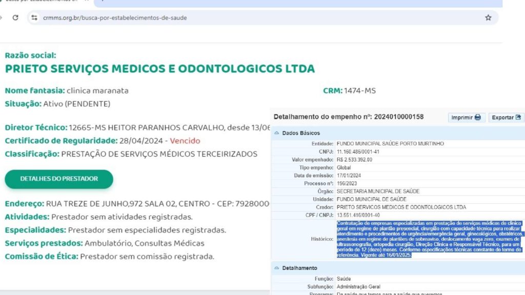 O prefeito Nelson Cintra (PSDB) contratou empresa com registro vencido para atender a saúde de Porto Murtinho. Além disso, a empresa contratada para realizar cirurgias possui registro no CRM (Conselho Federal de Medicina) apenas para consultas.