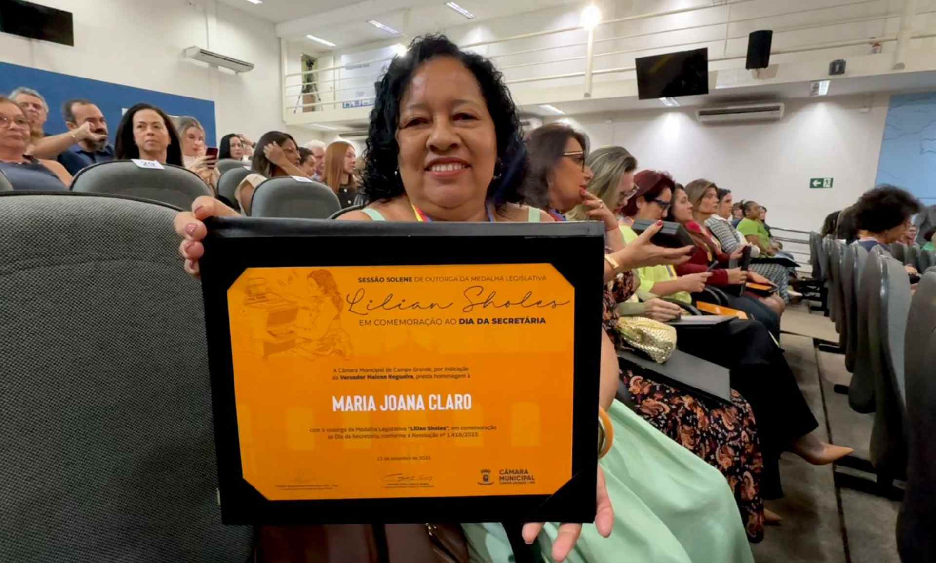 Os anos de trabalho e dedicação viraram homenagens, nesta segunda-feira (22), na Câmara de Vereadores de Campo Grande. Dona Joana foi condecorada com a Medalha Legislativa “Lilian Sholes”, em comemoração do Dia Municipal da Secretária.