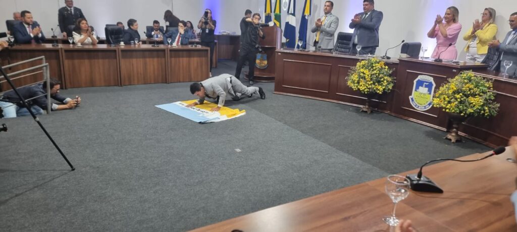 Após o discurso em que agradeceu o apoio político do governador Eduardo Riedel (PSDB) e também do ex-governador Reinaldo Azambuja, Marçal estendeu a bandeira do município e deitou-se ao chão para beijá-la.