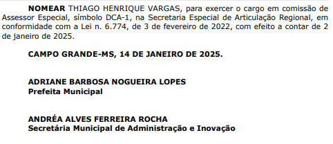 Além de Tiago Vargas, a prefeita Adriane Lopes não deixou de lado outros ex-vereadores do PP que não foram reeleitos. Sandro Benites foi nomeado como diretor-presidente da Funesp (Fundação Municipal de Esportes) enquanto Valdir Gomes assumiu como secretário-executivo da Cultura, na última segunda-feira (13).