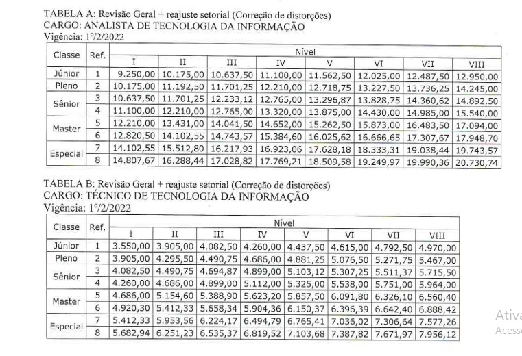 Para fins de progressão funcional, são constituídos 8 níveis e as classes são júnior, pleno, sênior, master e especial.