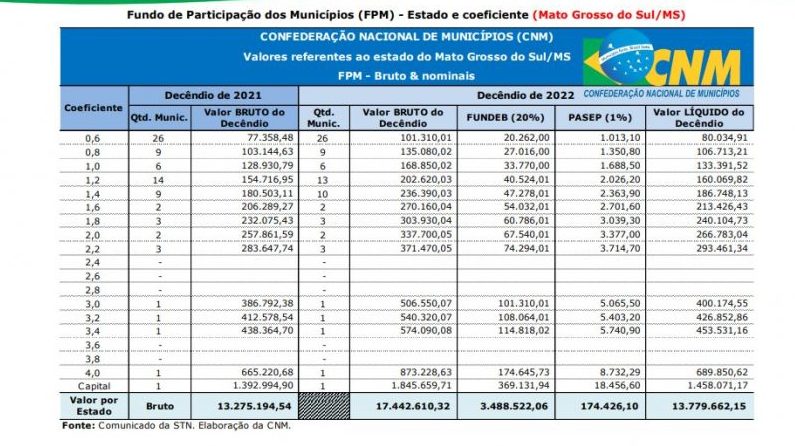 A segunda de julho do FPM (Fundo de Participação dos Municípios) traz R$ 17.442.610,32 aos cofres dos municípios de Mato Grosso do Sul. O valor será dividido entre as 79 cidades do Estado.