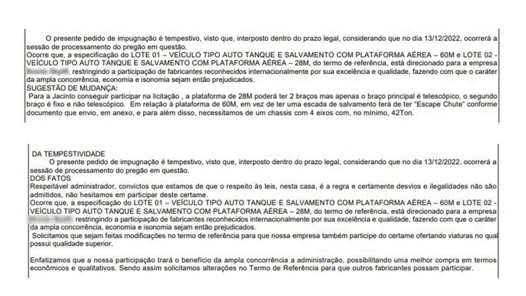Os dois pedidos também solicitam alterações no Termo de Referência para que outros fabricantes possam concorrer, e ditam as mudanças necessárias nas especificações do equipamento. As empresas são do Rio Grande do Sul e do Distrito Federal.