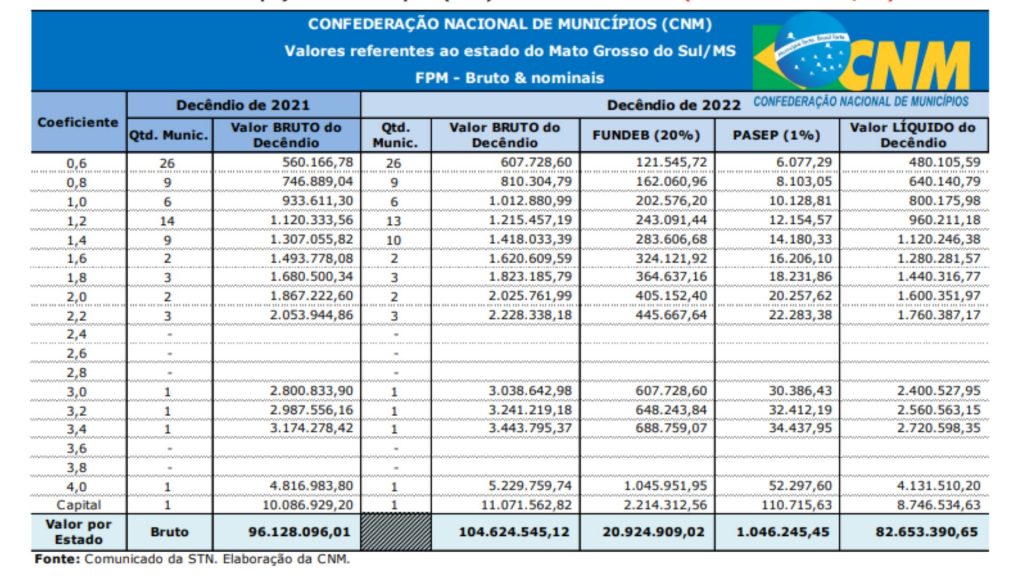 A primeira parcela do FPM (Fundo de Participação dos Municípios) de dezembro repassa R$ 104 milhões para os municípios de Mato Grosso do Sul. As 79 cidades do Estado dividem o valor total.