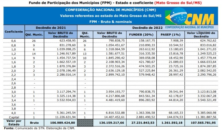 O primeiro repasse de maio do FPM (Fundo de Participação dos Municípios) aos municípios de Mato Grosso do Sul é de R$ 136.159.217,66. O valor é dividido entre as 79 cidades do Estado.
