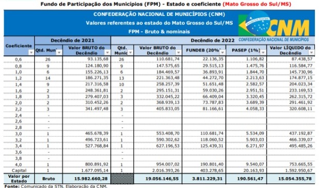 A segunda parcela de maio do FPM (Fundo de Participação dos Municípios) repassou R$ 19.056.146,55 aos municípios de Mato Grosso do Sul. O valor será dividido entre as 79 cidades do Estado.