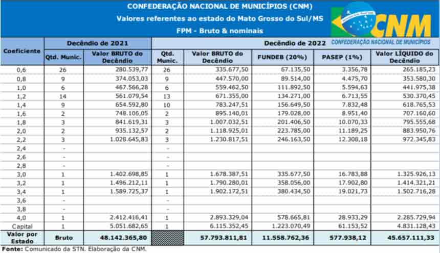 O último repasse de março do FPM (Fundo de Participação dos Municípios) somou R$ 57.793.811,81 aos cofres dos municípios de Mato Grosso do Sul. Esse valor será dividido entre as 79 cidades do Estado.