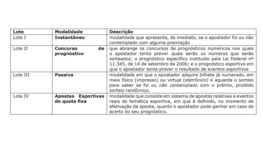 Segundo o documento, a exploração destas modalidades é considerada serviço público e os recursos com ela auferidos devem ser destinados a programas de seguridade social, habitação, desporto, educação, saúde, desenvolvimento social, cultural ou segurança pública.