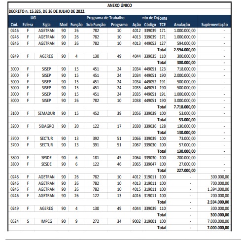 Segundo a publicação, o crédito total é de R$ 11.152.000,00. O montante foi dividido entre várias secretarias municipais da Capital, sendo a Sisep (Secretaria Municipal De Infraestrutura E Serviços Públicos), Agetran (Agência Municipal de Transporte e Trânsito), Semadur (Secretaria Municipal de Meio Ambiente e Desenvolvimento Urbano), Sidagro (Secretaria Municipal de Inovação, Desenvolvimento Econômico e Agronegócio), Sectur (Secretaria Municipal de Cultura e Turismo) Agereg (Agência de Regulação dos Serviços Públicos Delegados de Campo Grande) e IMPCG (Instituto Municipal de Previdência).