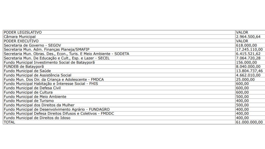 Para o exercício de 2023, a prefeitura de Batayporã estima orçamento com receita e fixa despesas em R$ 61 milhões. A LOA (Lei Orçamentária Anual) foi publicada nesta sexta-feira (23) no Diário Oficial da Assomasul (Associação dos Municípios de Mato Grosso do Sul).