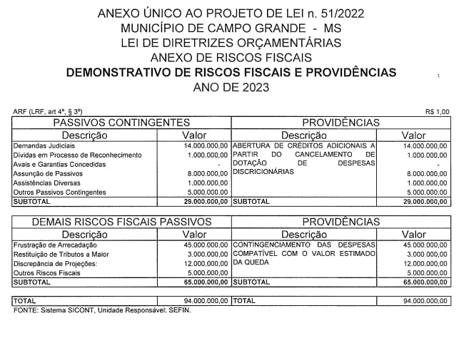 Os passivos contingentes são acrescentados de demais passivos, cuja previsão é de R$ 5 milhões, além de R$ 1 milhão em assistências diversas. Os riscos fiscais, neste caso, não têm nada a ver com as chamadas renúncias fiscais, que poderão chegar a R$ 33,7 milhões em 2023, somando a área de transporte com as isenções do imposto e também benefícios concedidos às empresas participantes do Prodes (Programa de Incentivos para Desenvolvimento Econômico e Social de Campo Grande) e outras concessões.