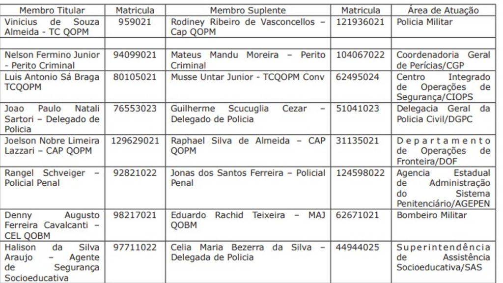 Entre os membros estão policiais militares, peritos criminais, delegados, agentes policiais penais, bombeiros, policiais do DOF (Departamento de Operações de Fronteira), além de servidores do Ciops e da SAS (Superintendência de Assistência Socioeducativa). A designação foi assinada pelo secretário da Sejusp, Antônio Carlos Videira. Confira os nomes dos servidores: