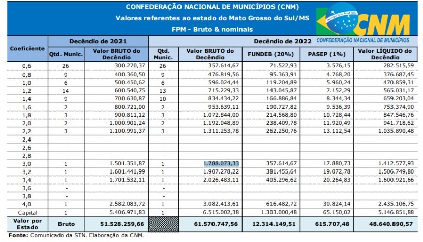 Vale lembrar que os valores do FPM mencionados são brutos e ainda passam por descontos do Fundeb (Fundo de Manutenção e Desenvolvimento da Educação Básica e de Valorização dos Profissionais da Educação), Saúde e Pasep (Programa de Formação do Patrimônio do Servidor Público).
