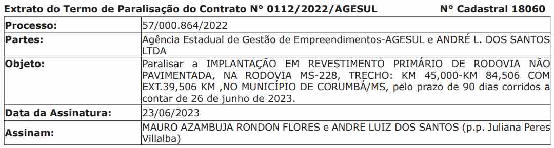 Apesar da publicação ter sido feita só nesta sexta-feira, a informação que consta é de que a assinatura da paralisação foi feita em 23 de junho. Assinam Mauro Azambuja Rondon Flores, da Agesul (Agência Estadual de Gestão e Empreendimentos), e André Patrola.