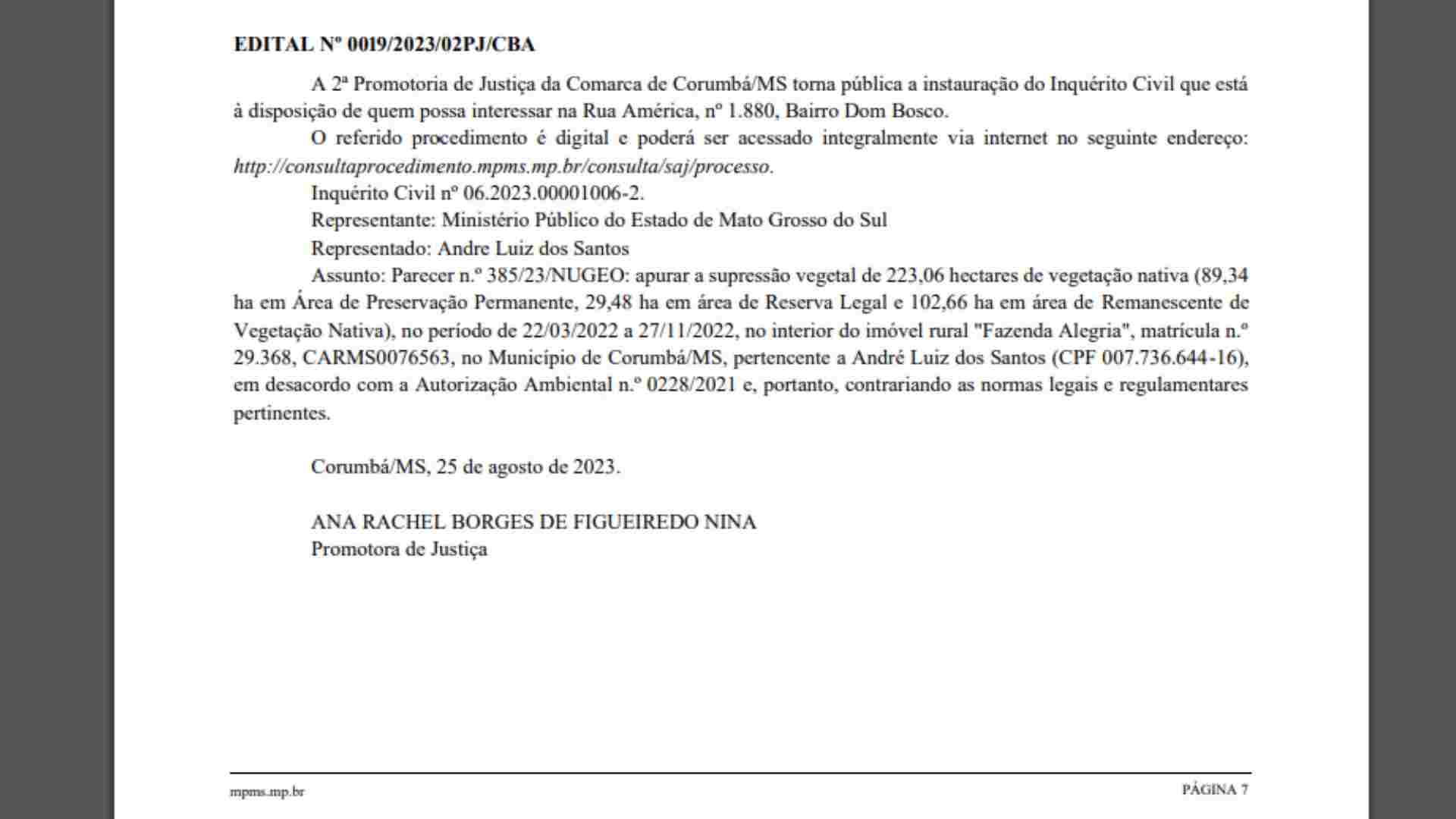 Instaurado em 25 de agosto, o Inquérito Civil 06.2023.00001006-2 analisa “supressão de 223,06 hectares de vegetação nativa (89,34 ha em Área de Preservação Permanente, 29,48 ha em área de Reserva Legal e 102,66 ha em área de Remanescente de Vegetação Nativa), no período de 22/03/2022 a 27/11/2022, no interior do imóvel rural ‘Fazenda Alegria’, matrícula n.º 29.368, CARMS0076563, no Município de Corumbá/MS, pertencente a André Luiz dos Santos, em desacordo com a Autorização Ambiental n.º 0228/2021 e, portanto, contrariando as normas legais e regulamentares pertinentes”.